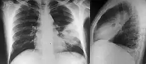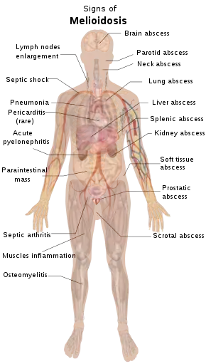 People with diabetes mellitus or regular exposure to the bacteria are at increased risk of developing melioidosis. The disease should be considered in those staying in endemic areas who develop fever, pneumonia, or abscesses in their liver, spleen, prostate, or parotid glands.[1] The clinical manifestation of the disease can range from simple skin changes to severe organ problems.[1] Skin changes can be nonspecific abscesses or ulcerations.[7] In northern Australia, 60% of the infected children presented with only skin lesions, while 20% presented with pneumonia.[3] The commonest organs affected are liver, spleen, lungs, prostate, and kidneys. Among the most common clinical signs are presence of bacteria in blood (in 40 to 60% of cases), pneumonia (50%), and septic shock (20%).[1] People with only pneumonia may have a prominent cough with sputum and shortness of breath. However, those with septic shock together with pneumonia may have minimal coughing.[2] Results of a chest X-ray can range from diffuse nodular infiltrates in those with septic shock to progressive solidification of the lungs in the upper lobes for those with pneumonia only. Excess fluid in the pleural cavity and gathering of pus within a cavity are more common for melioidosis affecting lower lobes of the lungs.[2] In 10% of cases, people develop secondary pneumonia caused by other bacteria after the primary infection.[3]