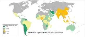 Melioidosis is endemic in parts of Southeast Asia (including Thailand,[17] Laos,[18] Singapore,[19] Brunei,[20] Malaysia,[21] Myanmar[22] and Vietnam[23]), southern China,[24] Taiwan[25] and northern Australia.[26] Heavy rainfall can increase its extent into central Australia.[26] India,[27] and sporadic cases in South America.[28] The true burden of melioidosis in Africa and Middle East remain unknown due to low amount of data. There were 24 African countries and three Middle Eastern countries predicted to be endemic with melioidosis, however not a single case was reported from them.[29] A total of 51 cases of melioidosis were reported in Bangladesh from 1961–2017. Nonetheless, lack of awareness and resources gives rise to underdiagnosis of the disease in the country.[30] In the United States, two historical cases (1950 and 1971) and three recent cases (2010, 2011, 2013) have been reported amongst people that did not travel overseas. Despite extensive investigations, the source of melioidosis was never confirmed. One possible explanation is that importation of medicinal plant products or exotic reptiles could have resulted in the introduction of melioidosis in the United States.[3] In Europe, more than half of the melioidosis cases are imported from Thailand.[31]