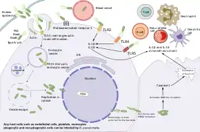 Inside the host cell, the bacteria move by inducing the polymerization of the host actin behind them, propelling the bacteria forward.[1] This actin-mediated motility is accomplished with the autotransporter BimA, which interacts with actin at the tail-end of the bacterium. Propelled by actin, the bacteria push against the host membrane, creating protrusions that extend into neighbouring cells. These protrusions cause neighboring cells to fuse, leading to the formation of multinucleated giant cells (MNGCs). When MNGCs lyse, they form plaques (a central clear area with a ring of fused cells) that provide shelter for the bacteria for further replication or latent infection. This same process in infected neurons can allow bacteria to travel through nerve roots in the spinal cord and brain, leading to inflammation of the brain and spinal cord. Besides spreading from cell to cell, the bacteria can also spread through the bloodstream, causing sepsis. The bacteria can survive in antigen-presenting cells and dendritic cells. Thus, these cells act as vehicles that transport the bacteria into the lymphatic system, causing widespread dissemination of the bacteria in the human body.[1][8]