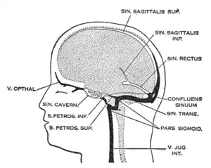 The meningeal lymphatic vessels (or meningeal lymphatics) are a network of conventional lymphatic vessels located parallel to the dural venous sinuses and middle meningeal arteries of the mammalian central nervous system (CNS). As a part of the lymphatic system, the meningeal lymphatics are responsible for draining immune cells, small molecules, and excess fluid from the CNS into the deep cervical lymph nodes.[1][2] Cerebrospinal fluid, and interstitial fluid are exchanged, and drained by the meningeal lymphatic vessels.[3]