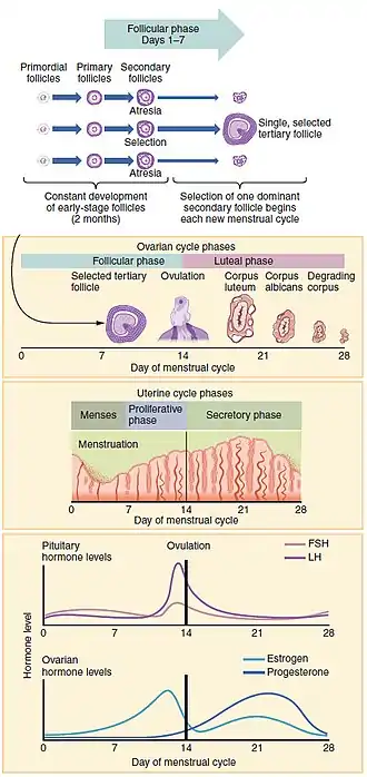 Between menarche and menopause the human ovaries regularly alternate between luteal and follicular phases during the monthly menstrual cycle.[20] Stimulated by gradually increasing amounts of estrogen in the follicular phase, discharges of blood flow stop and the uterus lining thickens. Follicles in the ovary begin developing under the influence of a complex interplay of hormones, and after several days one, or occasionally two, become dominant, while non-dominant follicles shrink and die. About mid-cycle, some 10–12 hours after the luteinizing hormone (LH) surges,[2] the dominant follicle releases an oocyte, in an event called ovulation.[21]