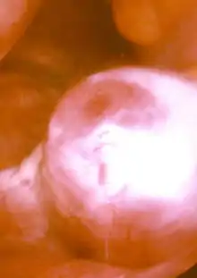 Fertilization usually takes place in the ampulla, the widest section of the fallopian tubes. A fertilized egg immediately starts the process of embryogenesis (development). The developing embryo takes about three days to reach the uterus, and another three days to implant into the endometrium. It has usually reached the blastocyst stage at the time of implantation: this is when pregnancy begins.[42] The loss of the corpus luteum is prevented by fertilization of the egg. The syncytiotrophoblast (the outer layer of the resulting embryo-containing blastocyst that later becomes the outer layer of the placenta), produces human chorionic gonadotropin (hCG), which is very similar to LH and preserves the corpus luteum. During the first few months of pregnancy, the corpus luteum continues to secrete progestoerone and estrogens at slightly higher levels than those at ovulation. After this and for the rest of the pregnancy, the placenta secretes high levels of these hormones – along with human chorionic gonadotropin (hCG), which stimulates the corpus luteum to secrete more progesterone and estrogens, blocking the menstrual cycle.[43] These hormones also prepare the mammary glands for milk[lower-alpha 2] production.[43]