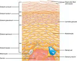 Merkel cells are found in the skin and some parts of the mucosa of all vertebrates. In mammalian skin, they are clear cells found in the stratum basale[4][5] (at the bottom of sweat duct ridges) of the epidermis approximately 10 μm in diameter. They also occur in epidermal invaginations of the plantar foot surface called rete ridges.[6] Most often, they are associated with sensory nerve endings, when they are known as Merkel nerve endings (also called a Merkel cell-neurite complex). They are associated with slowly adapting (SA1) somatosensory nerve fibers. They react to low vibrations (5–15 Hz) and deep static touch such as shapes and edges. Due to a small receptive field (extremely detailed info) they are used in areas like fingertips the most; they are not covered (shelled) and thus respond to pressures over long periods.