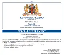 On 14 October 2010, the organisation's right to raise funds was stripped from it by the New South Wales Office of Liquor, Gaming and Racing, stating that its appeals had "not been conducted in good faith for charitable purposes".[24] In December 2012, the New South Wales Office of Fair Trading issued an order for the group to change its name within two months or be de-registered. The department described the group's name as being "misleading and a detriment to the community".[5][25][26] The group changed its name in February 2014.[13] In July 2018 the group changed its name to Australian Vaccination-risks Network Inc. citing that many in their group "did not feel comfortable with having the word 'skeptics' in" their name as the reason for the change. The group decided that the word "skeptic" too closely aligned them with Scientific Skepticism organisations such as the Australian Skeptics.[14][27]