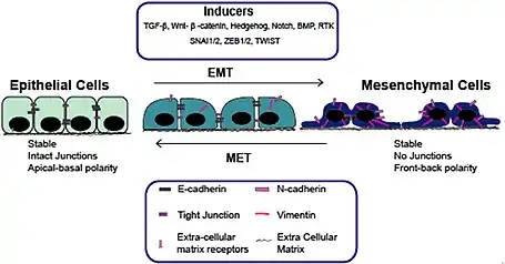Unlike epithelial cells – which are stationary and characterized by an apico-basal polarity with binding by a basal lamina, tight junctions, gap junctions, adherent junctions and expression of cell-cell adhesion markers such as E-cadherin,[4] mesenchymal cells do not make mature cell-cell contacts, can invade through the extracellular matrix, and express markers such as vimentin, fibronectin, N-cadherin, Twist, and Snail.[4] MET plays also a critical role in metabolic switching and epigenetic modifications. In general epithelium-associated genes are upregulated and mesenchyme-associated genes are downregulated in the process of MET.[5]