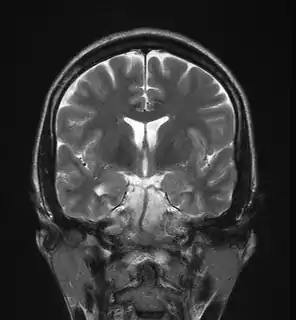 Mesial temporal sclerosis is a specific pattern of hippocampal neuron cell loss.[16][17] There are 3 specific patterns of cell loss. Cell loss might involve sectors CA1 and CA4, CA4 alone, or CA1 to CA4.[17] Associated hippocampal atrophy and gliosis is common.[16] MRI scan commonly displays increased T2 signal and hippocampal atrophy.[16] Mesial temporal sclerosis might occur with other temporal lobe abnormalities (dual pathology).[16] Mesial temporal sclerosis is the most common pathological abnormality in temporal lobe epilepsy.[16][17] It has been linked to abnormalities in TDP-43.[18]