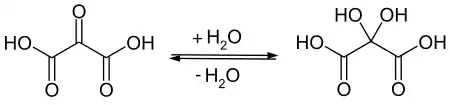 Mesoxalic acid readily absorbs and reacts with water to form a product commonly called "mesoxalic acid monohydrate", more properly dihydroxymalonic acid, HO−(C=O)−C(OH)2−(C=O)−OH.[2] In product catalogs and other contexts, the terms "mesoxalic acid", "oxomalonic acid" and so on often refer to this "hydrated" compound. In particular, the product traded as "sodium mesoxalate monohydrate" is almost always sodium dihydroxymalonate.