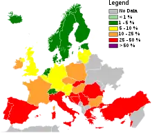 In the United States, most cases of CA-MRSA are caused by a CC8 strain designated ST8:USA300, which carries SCCmec type IV, Panton–Valentine leukocidin, PSM-alpha and enterotoxins Q and K,[56] and ST1:USA400.[60] The ST8:USA300 strain results in skin infections, necrotizing fasciitis, and toxic shock syndrome, whereas the ST1:USA400 strain results in necrotizing pneumonia and pulmonary sepsis.[54] Other community-acquired strains of MRSA are ST8:USA500 and ST59:USA1000. In many nations of the world, MRSA strains with different genetic background types have come to predominate among CA-MRSA strains; USA300 easily tops the list in the U.S. and is becoming more common in Canada after its first appearance there in 2004. For example, in Australia, ST93 strains are common, while in continental Europe ST80 strains, which carry SCCmec type IV, predominate.[61][62] In Taiwan, ST59 strains, some of which are resistant to many non-beta-lactam antibiotics, have arisen as common causes of skin and soft tissue infections in the community. In a remote region of Alaska, unlike most of the continental U.S., USA300 was found only rarely in a study of MRSA strains from outbreaks in 1996 and 2000 as well as in surveillance from 2004–06.[63]