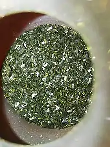 Methylene blue value reflects the amount of clay minerals in aggregate samples.[41] Methylene blue solution is successively added to fine aggregate which is being agitated in water. The presence of free dye solution can be checked with stain test on a filter paper.[42]