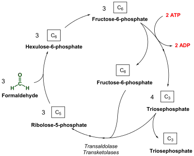 Like the RuBP cycle, this cycle begins with 3 molecules of ribulose-5-phosphate. However, instead of phosphorylating ribulose-5-phosphate, 3 molecules of formaldehyde form a C-C bond through an aldol condensation, producing 3 molecules of 3-hexulose 6-phosphate (hexulose phosphate). One of these molecules of hexulose phosphate is converted into GAP and either pyruvate or dihydroxyacetone phosphate (DHAP). The pyruvate or DHAP is used towards biomass while the other 2 hexulose phosphate molecules and the molecule of GAP are used to regenerate the 3 molecules of ribulose-5-phosphate.[6][22]