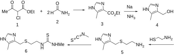 Reacting ethyl 2-chloroacetoacetate (1) with 2 molar equivalents of formamide (2) gives 4-carboethoxy-5-methylimidazole (3). Reduction of the carboxylic ester (3) with sodium in liquid ammonia via Birch reduction gives the corresponding alcohol (4). Reaction of that with cysteamine (mercaptoethylamine), as its hydrochloride, leads to intermediate 5. In the strongly acid medium, the amine is completely protonated; this allows the thiol to express its nucleophilicity without competition and the acid also activates the alcoholic function toward displacement. Finally, condensation of the amine with methyl isothiocyanate gives metiamide (6).
