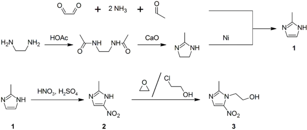 2-Methylimidazole (1) may be prepared via the Debus-Radziszewski imidazole synthesis, or from ethylenediamine and acetic acid, followed by treatment with lime, then Raney nickel. 2-Methylimidazole is nitrated to give 2-methyl-4(5)-nitroimidazole (2), which is in turn alkylated with ethylene oxide or 2-chloroethanol to give metronidazole (3):[50][51][52]