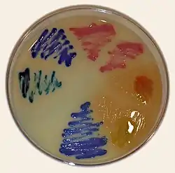 Differential or indicator media distinguish one microorganism type from another growing on the same medium.[9] This type of media uses the biochemical characteristics of a microorganism growing in the presence of specific nutrients or indicators (such as neutral red, phenol red, eosin y, or methylene blue) added to the medium to visibly indicate the defining characteristics of a microorganism. These media are used for the detection of microorganisms and by molecular biologists to detect recombinant strains of bacteria.