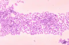 Micrococcus is generally thought to be a saprotrophic or commensal organism, though it can be an opportunistic pathogen, particularly in hosts with compromised immune systems, such as HIV patients.[6] It can be difficult to identify Micrococcus as the cause of an infection, since the organism is a normally present in skin microflora, and the genus is seldom linked to disease. In rare cases, death of immunocompromised patients has occurred from pulmonary infections caused by Micrococcus. Micrococci may be involved in other infections, including recurrent bacteremia, septic shock, septic arthritis, endocarditis, meningitis, and cavitating pneumonia (immunosuppressed patients).