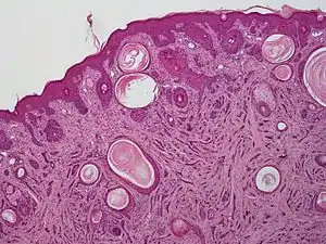 Microcystic adnexal carcinoma (MAC) is a rare sweat gland cancer,[1] which often appears as a yellow spot or bump in the skin. It usually occurs in the neck or head, although cases have been documented in other areas of the body. Most diagnosis occur past the age of 50. Although considered an invasive cancer, metastasis rarely occurs. If the tumor spreads, it can grow and invade fat, muscles, and other types of tissue.[2] Main treatments are wide local excision or Mohs micrographic surgery, which ensures that most, if not all, cancer cells are removed surgically.[3]