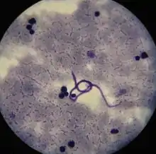 The microfilaria (plural microfilariae, sometimes abbreviated mf) is an early stage in the life cycle of certain parasitic nematodes in the family Onchocercidae.[2] In these species, the adults live in a tissue or the circulatory system of vertebrates (the "definitive hosts"). They release microfilariae into the bloodstream of the vertebrate host. The microfilariae are taken up by blood-feeding arthropod vectors (the "intermediate hosts"). In the intermediate host the microfilariae develop into infective larvae that can be transmitted to a new vertebrate host.
