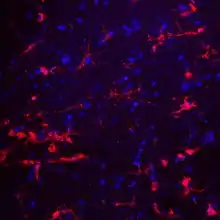 Microglia are a type of neuroglia (glial cell) located throughout the brain and spinal cord.[1] Microglia account for 10–15% of all cells found within the brain.[2] As the resident macrophage cells, they act as the first and main form of active immune defense in the central nervous system (CNS).[3] Microglia (and other neuroglia including astrocytes) are distributed in large non-overlapping regions throughout the CNS.[4][5] Microglia are key cells in overall brain maintenance—they are constantly scavenging the CNS for plaques, damaged or unnecessary neurons and synapses, and infectious agents.[6] Since these processes must be efficient to prevent potentially fatal damage, microglia are extremely sensitive to even small pathological changes in the CNS.[7] This sensitivity is achieved in part by the presence of unique potassium channels that respond to even small changes in extracellular potassium.[6] Recent evidence shows that microglia are also key players in the sustainment of normal brain functions under healthy conditions.[8] Microglia also constantly monitor neuronal functions through direct somatic contacts and exert neuroprotective effects when needed.[9]
