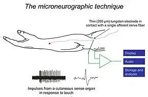 Microneurography is a neurophysiological method employed to visualize and record the traffic of nerve impulses that are conducted in peripheral nerves of waking human subjects. It can also be used in animal recordings. The method has been successfully employed to reveal functional properties of a number of neural systems, e.g. sensory systems related to touch, pain, and muscle sense as well as sympathetic activity controlling the constriction state of blood vessels. To study nerve impulses of an identified nerve, a fine tungsten needle microelectrode is inserted into the nerve and connected to a high input impedance differential amplifier. The exact position of the electrode tip within the nerve is then adjusted in minute steps until the electrode discriminates nerve impulses of interest. A unique feature and a significant strength of the microneurography method is that subjects are fully awake and able to cooperate in tests requiring mental attention, while impulses in a representative nerve fibre or set of nerve fibres are recorded, e.g. when cutaneous sense organs are stimulated or subjects perform voluntary precision movements.