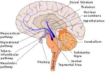 The midbrain tegmentum is also an important part of the dopaminergic system which is essential for feelings of reward and pleasure. Two regions in the midbrain tegmentum are of particular interest. The first one is the substantia nigra which is an important part of the nigrostriatal pathway. This pathway serves to coordinate motor movements and when left unbalanced, motor deficits would follow. For instance, when the dopamine neurons are lost from the substantia nigra, the condition of extreme muscle rigidity occurs as in the Parkinson's disease. The second region is the ventral tegmental area (VTA; or simply ventral tegmentum) which is at the hub of the mesolimbic pathway. Specifically, the VTA is the origin of dopaminergic cell bodies from which signals reach the anterior parts of the brain (e.g., frontal lobes) as well as the posterior parts (e.g., cerebellum). Because of this pathway regulates the experience of reward and pleasure, it is not surprising to see that food and drugs affect it the most in terms of a loss of impulse control. That is, the mesolimbic pathway is essential in regulating drug addiction. The potential mechanism is through the associative learning of the environmental cues and reward. For instance, through each drug use, individuals increasingly associate the cues related to each drug use (e.g., the room in which the drug is taken or the people with which individuals take drug). Over time, the drug enhances the dopamine-related, classically-conditioned cues associated with drug taking. As a result, later encounters with these cues will produce and heighten dopamine activity and subsequently prompt individuals to crave drugs. Moreover, excessive mesolimbic dopamine activity plays a role in schizophrenia, a behavioral disorder characterized by delusions, hallucinations, blunted emotion, agitation, etc. On the other hand, a lack of mesolimbic dopamine activity may induce deficits in attention.[1]