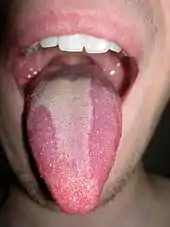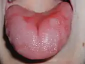 Geographic tongue, also known by several other terms,[note 1] is a condition of the mucous membrane of the tongue, usually on the dorsal surface. It is a common condition, affecting approximately 2–3% of the general population.[2][7] It is characterized by areas of smooth, red depapillation (loss of lingual papillae) which migrate over time. The name comes from the map-like appearance of the tongue,[8] with the patches resembling the islands of an archipelago.[2] The cause is unknown, but the condition is entirely benign (importantly, it does not represent oral cancer), and there is no curative treatment. Uncommonly, geographic tongue may cause a burning sensation on the tongue, for which various treatments have been described with little formal evidence of efficacy.