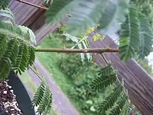 The fern-like branches have leaves that are Mimosa like, finely pinnate, growing to 5 cm (2.0 in) long. Each compound leaf contains 15–33 pairs of bright green leaflets 5–6 mm (0.20–0.24 in) long. The tree itself grows up to 8 m (26 ft) tall[3] and it can reach 4–5 m (13–16 ft) tall in less than 5 years. The white,[3] fragrant flowers occur in loosely cylindrical spikes 4–8 cm (1.6–3.1 in) long. In the Northern Hemisphere it blossoms and produces fruit from November to June or July.[4] In the Southern Hemisphere it blooms primarily from September to January. The fruit is brittle and averages 2.5–5 cm (0.98–1.97 in) long. Each pod contains 4–6 seeds that are oval, flat, light brown and 3–4 mm (0.12–0.16 in) in diameter. There are about 145 seeds/1 g (0.035 oz).[5] In the Southern Hemisphere, the fruit ripens from February to April.