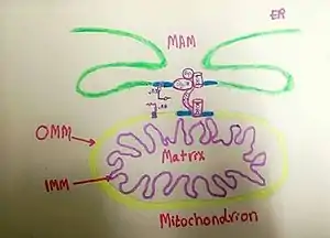 Mitochondria-associated membranes (MAM) represent a region of the endoplasmic reticulum (ER) which is reversibly tethered to mitochondria. These membranes are involved in import of certain lipids from the ER to mitochondria and in regulation of calcium homeostasis, mitochondrial function, autophagy and apoptosis. They also play a role in development of neurodegenerative diseases and glucose homeostasis.[1] when the mitochondria does not function well enough the cell becomes very unwell and the organism they live inside becomes cry sick and may even die as a result of the disfunction this may then