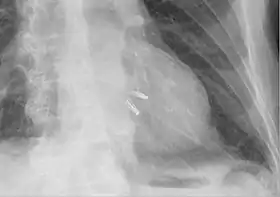 Chest radiograph showing two MitraClips projecting over the heart.
