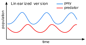 A sample time-series of the Lotka–Volterra model. Note that the two populations exhibit cyclic behaviour.