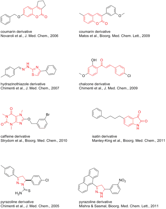 - compound #2, Matos MJ, Vazquez-Rodriguez S, Uriarte E, Santana L, Viña D (July 2011). "MAO inhibitory activity modulation: 3-Phenylcoumarins versus 3-benzoylcoumarins". Bioorg. Med. Chem. Lett. 21 (14): 4224–7. doi:10.1016/j.bmcl.2011.05.074. PMID 21684743.