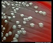 Morganella morganii is a species of Gram-negative bacteria.[2] It has a commensal relationship within the intestinal tracts of humans, mammals, and reptiles as normal flora.[2] Although M. morganii has a wide distribution, it is considered an uncommon cause of community-acquired infection and it is most often encountered in postoperative and other nosocomial infections such as urinary tract infections.[3]
