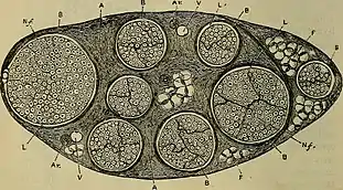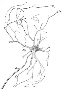 A motor nerve is a nerve located in the central nervous system (CNS), usually the spinal cord, that sends motor signals from the CNS to the muscles of the body. This is different from the motor neuron, which includes a cell body and branching of dendrites, while the nerve is made up of a bundle of axons. Motor nerves act as efferent nerves which carry information out from the CNS to muscles, as opposed to afferent nerves (also called sensory nerves), which send signals from sensory receptors in the periphery to the CNS.[1] Efferent nerves can also connect to glands or other organs/issues instead of muscles (and so motor nerves are not equivalent to efferent nerves).[2][3] In addition, there are nerves that serve as both sensory and motor nerves called mixed nerves.[4]