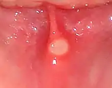 Erosions, which involve the epithelial layer, are red in appearance since the underlying lamina propria shows through. When the full thickness of the epithelium is penetrated (ulceration), the lesion becomes covered with a fibrinous exudate and takes on a yellow-grey color. Because an ulcer is a breach of the normal lining, when seen in cross section, the lesion is a crater. A "halo" may be present, which is a reddening of the surrounding mucosa and is caused by inflammation. There may also be edema (swelling) around the ulcer. Chronic trauma may produce an ulcer with a keratotic (white, thickened mucosa) margin.[5] Malignant lesions may ulcerate either because the tumor infiltrates the mucosa from adjacent tissues, or because the lesion originates within the mucosa itself, and the disorganized growth leads to a break in the normal architecture of the lining tissues. Repeat episodes of mouth ulcers can be indicative of an immunodeficiency, signaling low levels of immunoglobulin in the oral mucous membranes. Chemotherapy, HIV, and mononucleosis are all causes of immunodeficiency/immunosuppression with which oral ulcers may become a common manifestation. Autoimmunity is also a cause of oral ulceration. Mucous membrane pemphigoid, an autoimmune reaction to the epithelial basement membrane, causes desquamation/ulceration of the oral mucosa. Numerous aphthous ulcers could be indicative of an inflammatory autoimmune disease called Behçet's disease. This can later involve skin lesions and uveitis in the eyes. Vitamin C deficiency may lead to scurvy which impairs wound healing, which can contribute to ulcer formation.[9] For a detailed discussion of the pathophysiology of aphthous stomatitis, see Aphthous stomatitis#Causes.