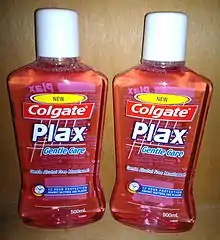 Triclosan is a non-ionic chlorinate bisphenol antiseptic found in some mouthwashes.[97] When used in mouthwash (e.g. 0.03%), there is moderate substantivity, broad spectrum anti-bacterial action, some anti-fungal action and significant anti-plaque effect, especially when combined with copolymer or zinc citrate.[58] Triclosan does not cause staining of the teeth.[58] The safety of triclosan has been questioned.[98]