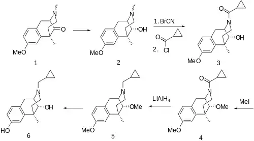 Reduction of the carbonyl group in oxygenated benzomorphan 1 affords the corresponding alcohol (2). This intermediate is then N-demethylated by means of BrCN. Acylation with cyclopropylcarbonyl chloride[5][6] gives the amide (3). The alcohol is then converted to the ether by treatment with MeI and base (4). Treatment with LiAlH4 serves to reduce the amide function. Cleavage of the phenolic ether by one of the standard schemes affords moxazocine (6).
