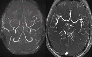 Moyamoya disease is a disease in which certain arteries in the brain are constricted. Blood flow is blocked by constriction and blood clots (thrombosis).[1] A collateral circulation develops around the blocked vessels to compensate for the blockage, but the collateral vessels are small, weak, and prone to bleeding, aneurysm and thrombosis. On conventional MR angiography, these collateral vessels have the appearance of a "puff of smoke" (described as "もやもや (moyamoya)" in Japanese).[1]