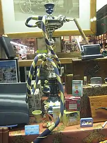 Smoking muʽassel exposes users to many of the same toxicants found in cigarettes. Substantial amounts of carbon monoxide, nicotine, and tar have been found in inhaled hookah smoke. A single session of smoking muʽassel results in far more toxicants inhaled than a session of cigarette smoking, largely because a session of hookah use is much longer than an average session of cigarette smoking: 60 minutes on average for hookah users versus five minutes for a single cigarette.[24] A typical session of smoking muʽassel results in a user inhaling 90,000 ml of smoke versus 500 ml for a cigarette, as well as 1.7 times as much nicotine, 8.4 times as much carbon monoxide, and 36 times as much tar.[24] Muʽassel smoking also exposes users to heavy metals and is thought to expose users to more carcinogens than cigarettes.[25] The charcoal used to heat up the muʽassel has unique health detriments in addition to those of the muʽassel itself, including increased carbon monoxide and metal inhalation.[26] These toxicants have led the American Lung Association, Centers for Disease Control and Prevention, and Food and Drug Administration to conclude that smoking muʽassel using a hookah "has many of the same health risks as cigarette smoking."[25][27][28] These risks include lung cancer, respiratory disease, low birth weight in babies,[26] increased risk of respiratory disease in babies, heart disease and artery clogging, as well as oral, stomach, esophagus, and bladder cancers.[27] Herbal muʽassel and shisha poses similar risks to its tobacco-containing counterpart: smoke from herbal muʽassel contains equal or greater levels of carbon monoxide, nitric oxide, aldehydes, tar, and carcinogenic polycyclic aromatic hydrocarbons (PAH) as tobacco-containing smoke.[29] These chemicals contribute to cancers, heart disease, and lung disease.[27]