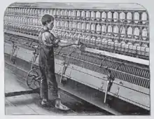 A pair of 150-foot (46 m) long self-acting mules with 1320 spindles each would be tended by three employees: the minder or operative spinner, the big piecer, and the little piecer. The little piecer would start in the mulegate on his fourteenth birthday, and rise to the status of a minder. All these men worked barefoot, wearing white light cotton trousers. There were four basic tasks: creeling, doffing, cleaning and piecing.[4] Creeling and piecing would both be done while the mule was in motion. Creeling was about replacing the bobbins in the creel while piecing the old disappearing thread with the new; it was done from behind the mule. Piecing was about joining any ends that had broken. The piecer would catch the snarled fuzzy broken end at the top of the spindle in his right hand and pull out some clean thread and wrap it around the left forefinger. This would be pressed into clean roving emerging from the attenuating rollers, pulling the hand away when the two had twisted together. All this was done while walking back and forth with the carriage, contact being made using the three of four seconds when the piecer was close enough to lean over the frame and reach the rollers. At this moment, left arm and leg forward, his crotch was adjacent to the base of the spindles.[5]