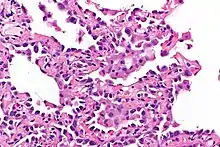 - Enlarged cuboidal cells lining mildly thickened alveolar septa.[11]