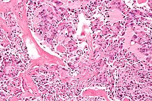 Micrograph of a medullary thyroid carcinoma, as may be seen in MEN 2A and MEN 2B. H&E stain