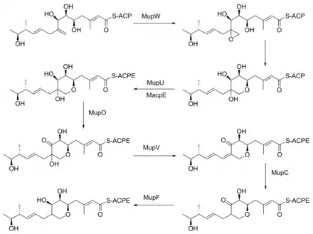 The formation of the pyran ring requires many enzyme-mediated steps (Figure 4). The double bond between C8 and C9 is proposed to migrate to between C8 and C16.[22] Gene knockout experiments of mupO, mupU, mupV, and macpE have eliminated PA-A production.[22] PA-B production is not removed by these knockouts, demonstrating that PA-B is not created by hydroxylating PA-A. A knockout of mupW eliminated the pyran ring, identifying MupW as being involved in ring formation.[22] It is not known whether this occurs before or after the esterification of monic acid to 9-hydroxy-nonanoic acid.