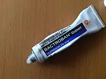 Mupirocin, sold under the brand name Bactroban among others, is a topical antibiotic useful against superficial skin infections such as impetigo or folliculitis.[3][4][5] It may also be used to get rid of methicillin-resistant S. aureus (MRSA) when present in the nose without symptoms.[4] Due to concerns of developing resistance, use for greater than ten days is not recommended.[5] It is used as a cream or ointment applied to the skin.[4]
