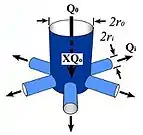 For connecting a parent pipe with radius of r0 to many children pipes with radius of ri , the formula of generalized Murray's law is: , where the X is the ratio of mass variation during mass transfer in the parent pore, the exponent α is dependent on the type of the transfer. For laminar flow α = 3; for turbulent flow α = 7/3; for molecule or ionic diffusion α = 2; etc.