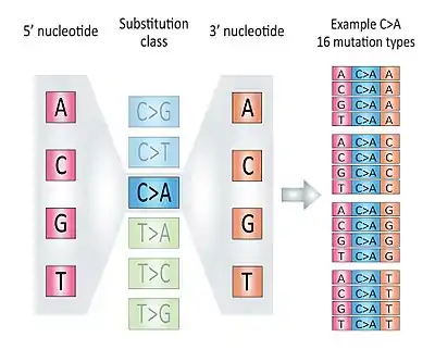 Mutational signatures are characteristic combinations of mutation types arising from specific mutagenesis processes such as DNA replication infidelity, exogenous and endogenous genotoxins exposures, defective DNA repair pathways and DNA enzymatic editing.[1]