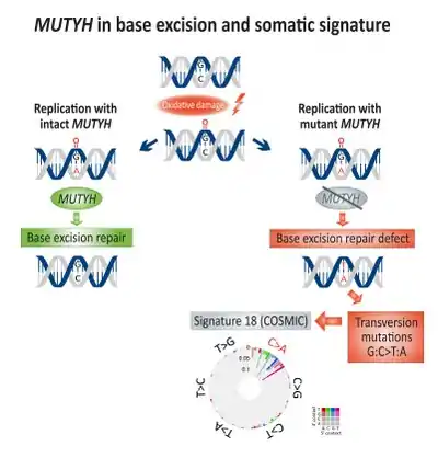 Somatic enrichment for transversion mutations (G:C>T:A) has been associated with base excision repair (BER) deficiency and linked to defective MUTYH, a DNA glycosylase, in colorectal cancer.[14] Direct DNA oxidation damage leads to the creation of 8-Oxoguanine, which if remains un-repaired, will lead to incorporation of adenine instead of cytosine during DNA replication. MUTYH encodes the mutY adenine glycosylase enzyme which excise the mismatched adenine from 8-Oxoguanine:adenine base pairing, therefore enabling DNA repair mechanisms involving OGG1 (Oxoguanine glycosylase) and NUDT1 (Nudix hydrolase 1, also known as MTH1, MutT homolog 1) to remove the damaged 8-Oxoguanine.[15]