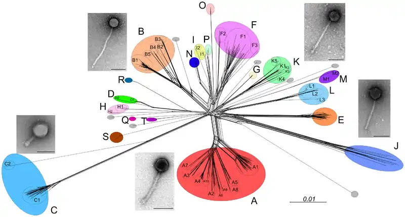 Thousands of mycobacteriophage have been isolated using a single host strain, Mycobacterium smegmatis mc2155, over 1400 of which have been completely sequenced.[2] These are mostly from environmental samples, but mycobacteriophages have also been isolated from stool samples of tuberculosis patients,[7] although these have yet to be sequenced.[8] About 30 distinct types (called clusters, or singletons if they have no relatives) that share little nucleotide sequence similarity have been identified. Many of the clusters span sufficient diversity that the genomes warrant division into subclusters (Figure 1).[8]