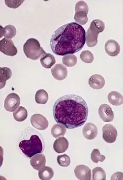 The main features that distinguish a myeloblast from a lymphoblast upon microscopic examination are the presence of cytoplasmic granules, the lesser degree of condensation in the nuclear chromatin, and the increased prominence of the nucleoli.[2]