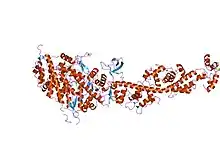There are many cell-specific isoforms of myosin heavy chains, coded for by a multi-gene family.[2] Myosin interacts with actin to convert chemical energy, in the form of ATP, to mechanical energy.[3] The 3-D structure of the head portion of myosin has been determined [4] and a model for actin-myosin complex has been constructed.[5]