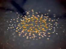 It is very likely that cells communicate during the process of fruiting and sporulation, because a group of cells that starved together form myxospores inside fruiting bodies.[1] Intercellular signal appears to be necessary to ensure that sporulation happens in the proper place and at the proper time.[16] Research supports the existence of an extracellular signal, A-factor, which is necessary for developmental gene expression and for the development of a complete fruiting body.[17]