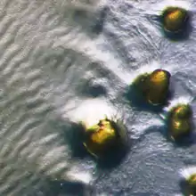 An important part of M. xanthus behavior is its ability to move on a solid surface by a mechanism called "gliding".[3] Gliding Motility is a method of locomotion that allows for movement, without the help of flagella, on a solid surface. Gliding Motility is also called A-motility (adventurous).[4] In A motility, single cells move, resulting in a distribution with many single cells. M. xanthus have the ability to use a second type of motility. This motility is called Social motility, single cells do not move, but cells that are close to one another move. This leads to a spatial distribution of cells with many clusters and few isolated single cells.[4] This motility depend on the presence of the Type IV pili[5] and divers polysaccharides.[6][7]