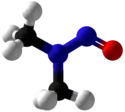 The C2N2O core of NDMA is planar, as established by X-ray crystallography. The central nitrogen is bound to two methyl groups and the NO group with bond angles of 120°. The N-N and N-O distances are 1.32 and 1.26 Å, respectively.[17]